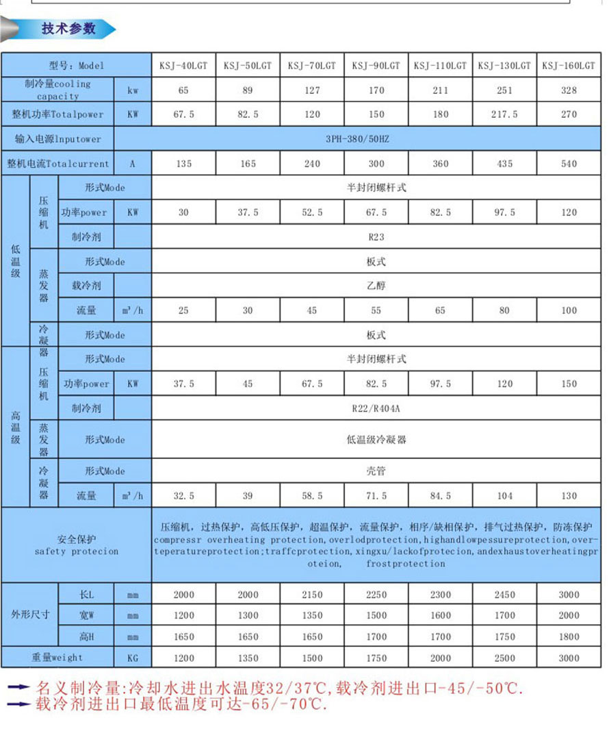 1.二元復疊低溫制冷機組:主要有低溫級活塞式復疊機組及低溫級螺桿式復疊機組等兩個系列;該系統采用二元復疊制冷系統,由高溫級(R404A/R22)低溫級R23組合而成,可提供-30℃- -85℃超低溫工藝冷源;機組制冷量范圍在5kw~700kw;