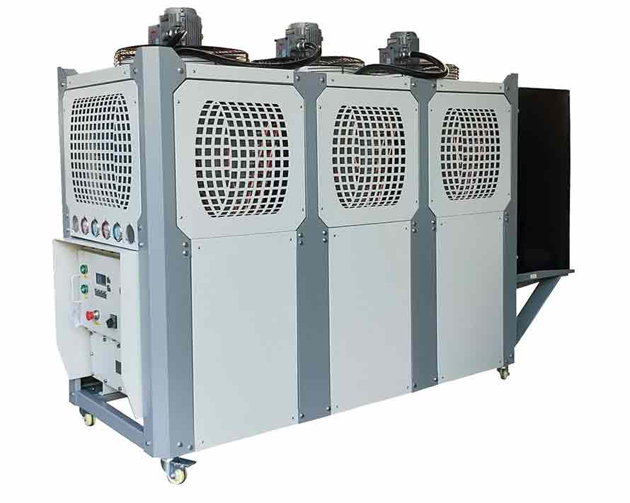 風(fēng)冷式防爆型化工制冷機(jī)組通過風(fēng)扇以空氣為冷凝方式的控溫設(shè)備,有箱式和螺桿式,單機(jī)輸出馬車從1HP~220HP.